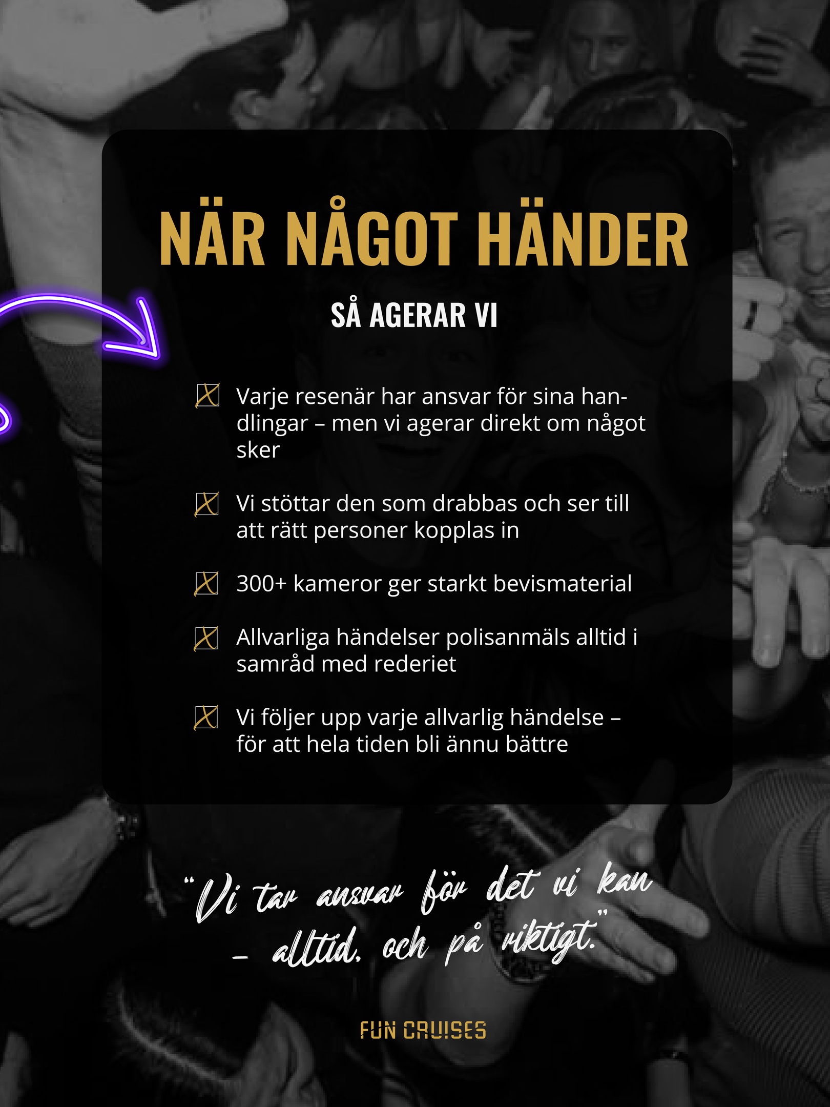 Fun Crew finns ute i korridorer och gemensamma utrymmen hela natten – just för att vara synliga, förebygga problem och finnas till hands om något känns fel. Men vi har inte möjlighet att hjälpa till att leta efter vänner som du tappat bort tillfälligt. Vi kan inte gå in i hytter utan tillstånd, och det är viktigt att vi behåller vår närvaro där flest människor rör sig – det är där vi gör störst skillnad.